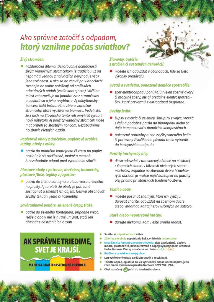 Aby sa odpad správne triedil aj v čase Vianoc a množstvo vytriedeného odpadu sa zvyšovalo, najlepšou cestou je neustále vzdelávať a motivovať obyvateľstvo v období pred aj počas sviatkov.